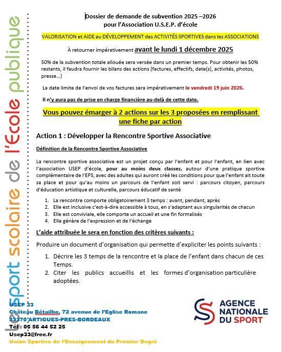 Voici les documents d'aides financières USEP pour l'année 2025/2026
